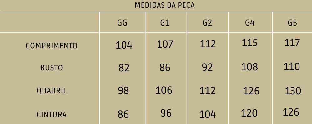 Medidas da modelo: altura 1,60 m | busto 104 cm | cintura 90 cm | quadril 136 cm